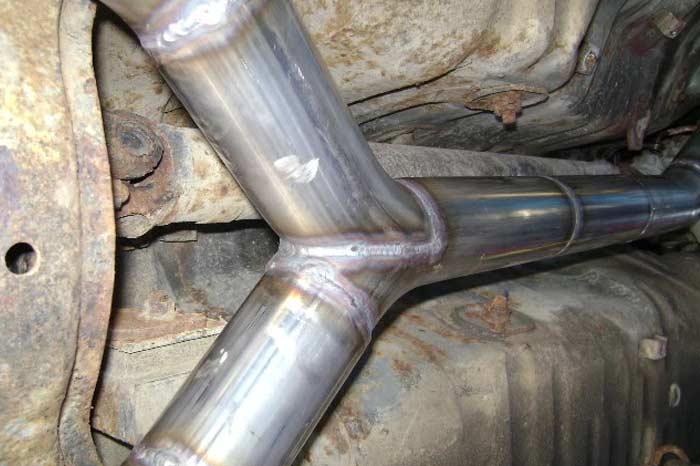 Note the quality of welds, especially on a tough weld like a "Y" joint. Note how clean we are on welding the hanger bracket to the muffler.